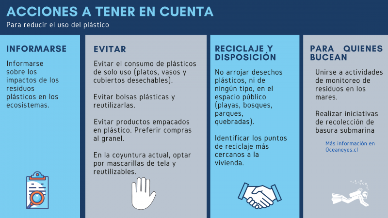 Por su parte, desde el mundo del buceo, distintas organizaciones como Ocean Eyes se han puesto en la tarea de generar conciencia sobre el impacto de los residuos de plástico en ecosistemas marinos, han incentivado la recopilación de datos al respecto y difunden información educativa dirigida a todo tipo de público.
